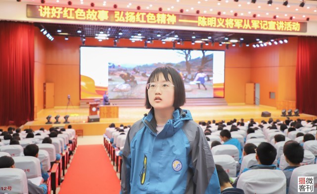 七三班孙凌薇同学分享了聆听陈明义将军从军记的感想。她说自己要从现在做起,从一点一滴做起,把对祖国、对人民的爱,把个人的理想,心愿和抱负,化为立志图强,报效祖国的实际行动,为建设美丽家乡而努力学习。