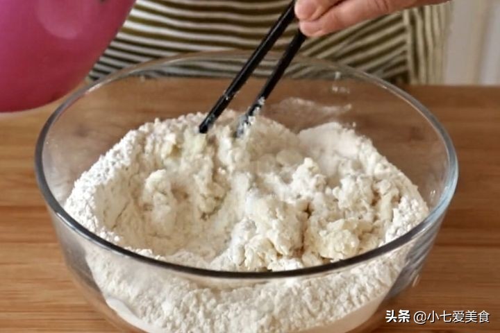 第一步:准备600克面粉,倒上开水400毫升先搅拌成絮状,再加上一点食用油揉成一个面团,在小碗中加上2勺面粉、4勺白糖搅拌均匀备用。