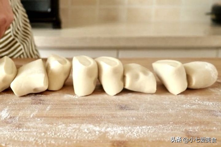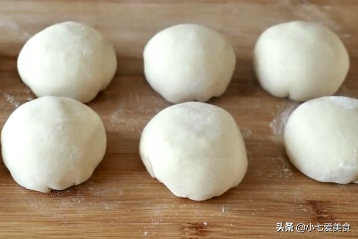 第二步:把面团取出来,把表面揉光滑,再分成一样大的剂子,把每个剂子擀成中间厚四周薄的面皮,放上糖馅包起来,把开口处捏紧实。
