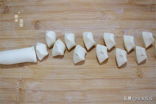 5,醒好的面团移到面板上,搓成长条,再切成小剂子。