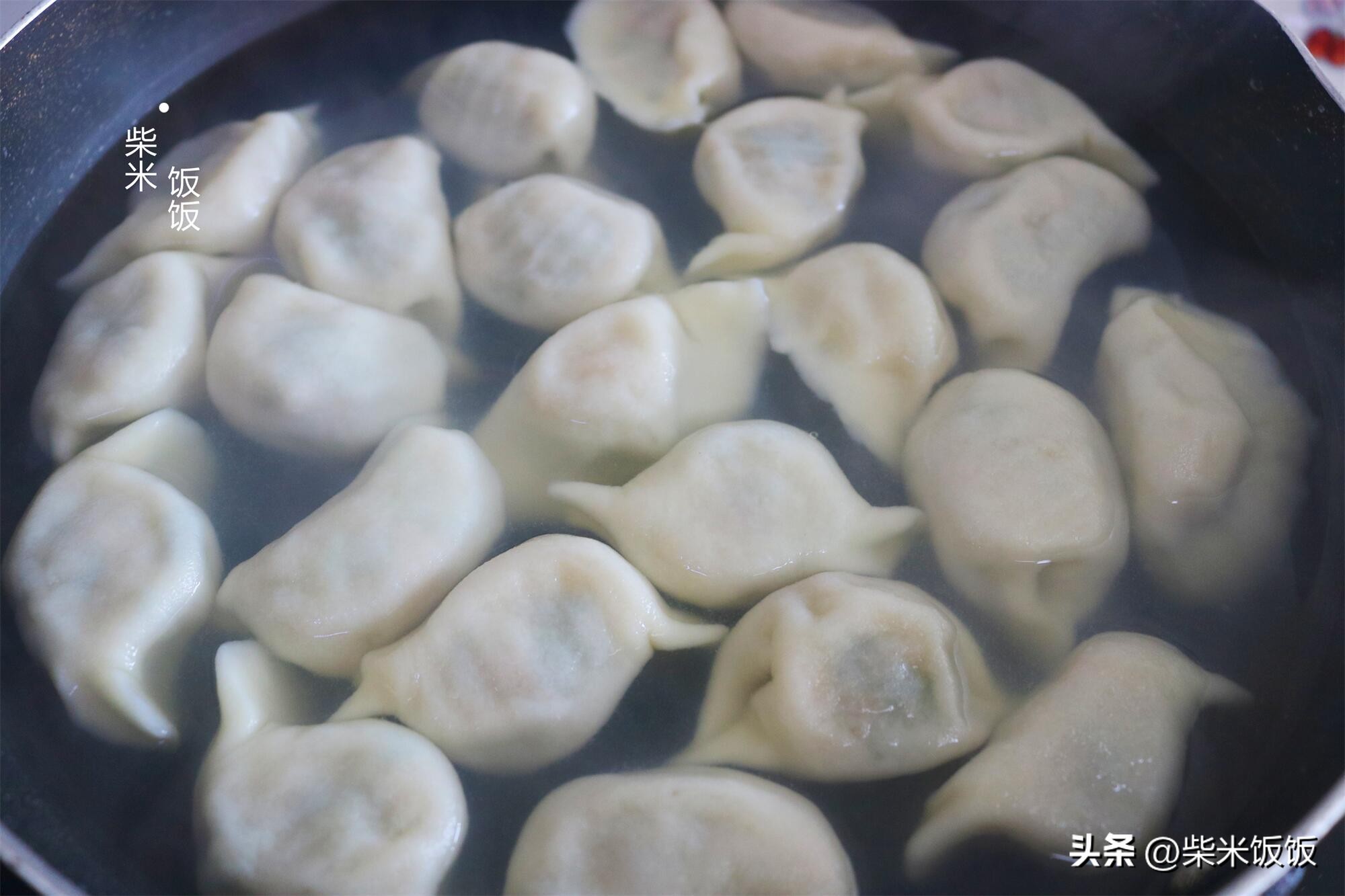 7,包好的饺子开水下锅,用铲子沿着锅底轻轻推动几次,防止饺子粘锅。大火煮开后淋入半碗凉水,反复2~3次,待饺子漂浮起来,饺子皮变得透明即可捞出。