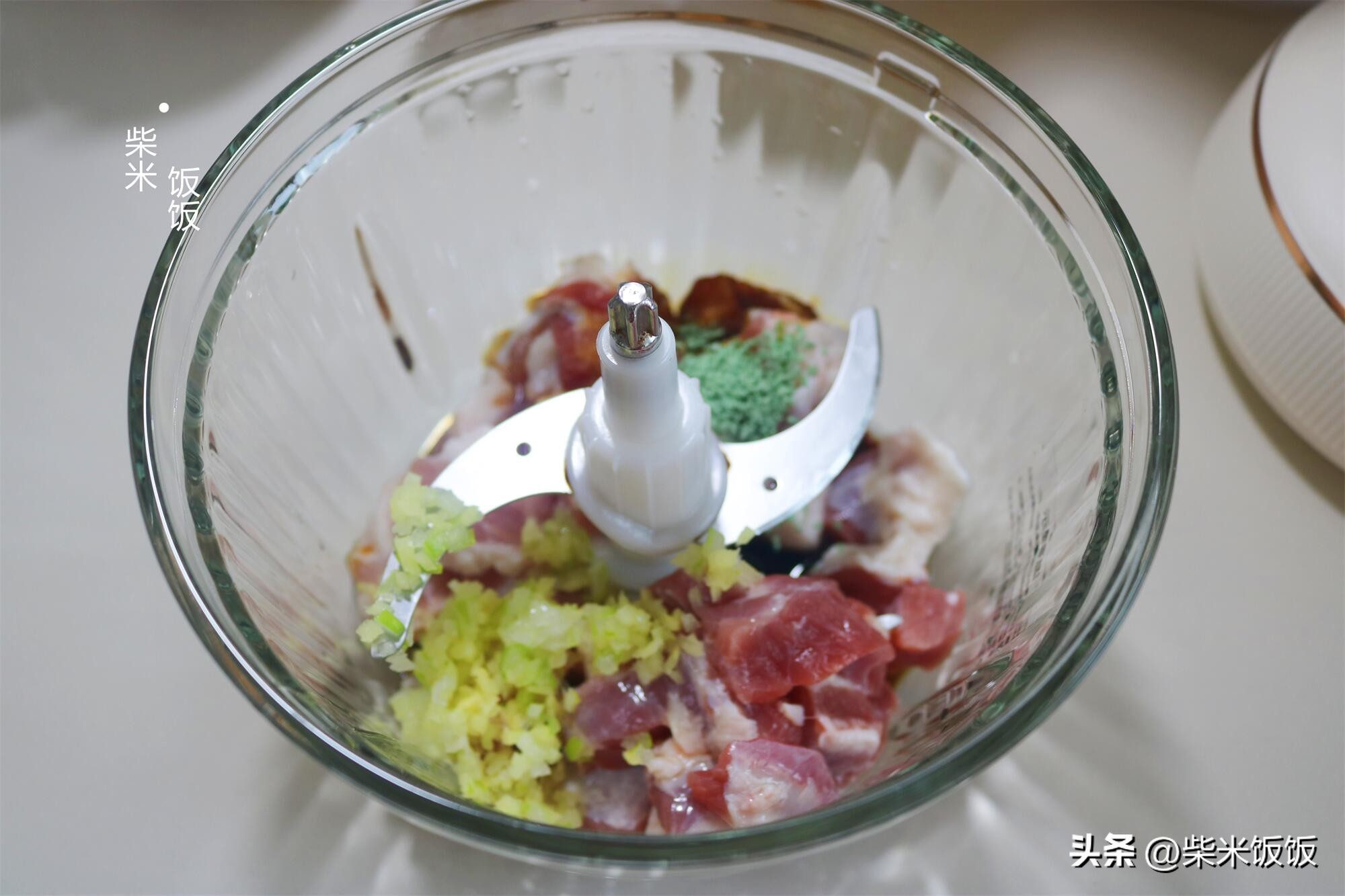 2,肥瘦二八的猪肉洗净,切成小块。加葱、姜、盐、老抽、生抽、鸡精调味,绞成细腻的肉馅。