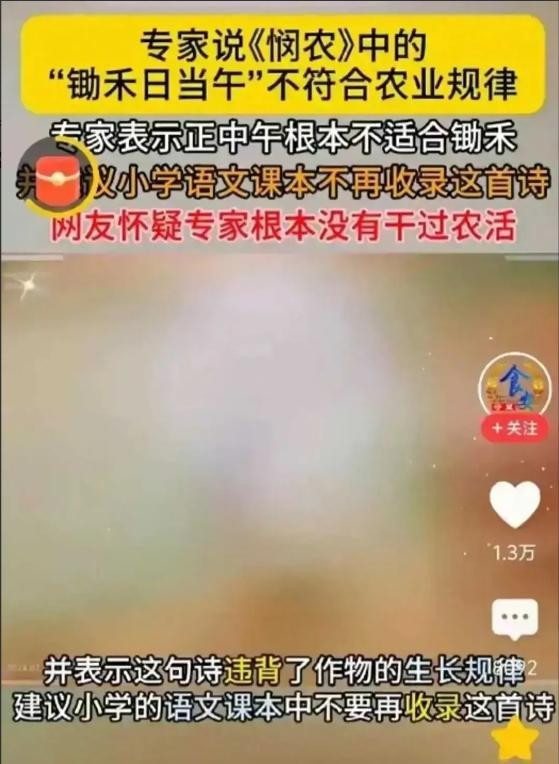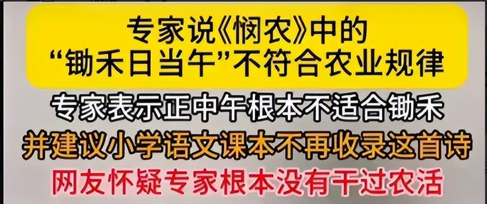 据了解,有专家认为"锄禾日当午"这句诗与现代农业生产实践严重不符。他们认为,在正午时分,当日头最为炎热时,农民是绝不可能选择在田间耕作的。