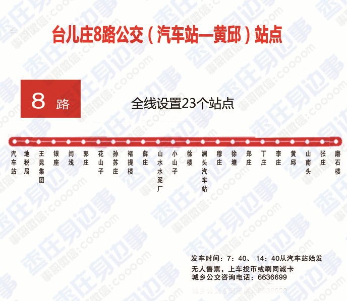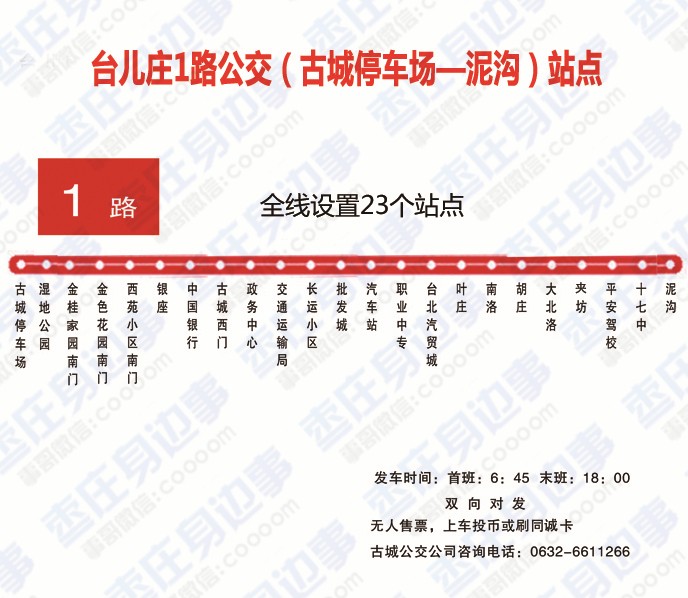 站点:台儿庄古城站、王晁集团、台儿庄开发区、泥沟、吴林、温泉小镇、枣庄客运换乘中心。票价:3元