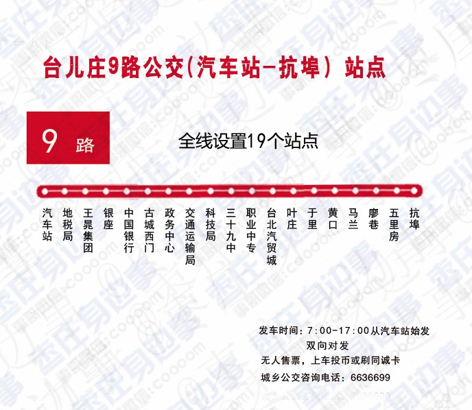 站点:国泰花园、苹果花园、市妇保院、枣庄三中、市立医院、人力资源市场、清华园、联通换乘中心。票价:2元