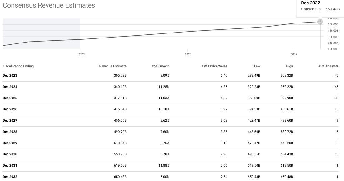2024 年 12 月:收入预估增至 3,401.2 亿美元,同比增长 11.25%。2025年12月:收入预计将增至3776.1亿美元,保持11.03%的同比增长率。