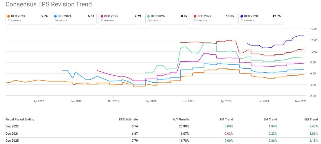2024 年 12 月:预计每股收益增至 6.67 美元,呈现持续积极趋势,同比增长 16.07%。2025年12月:每股收益预估进一步升至7.79美元,同比持续增长16.78%。