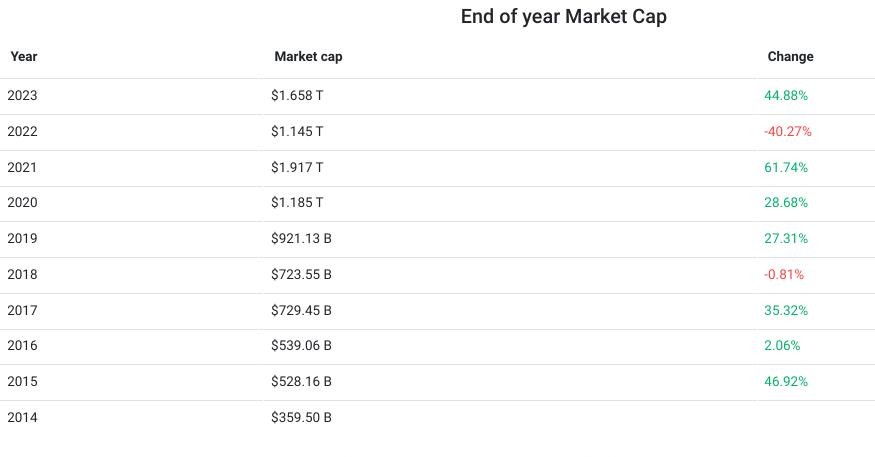 2023 年:市值:1.658万亿美元影响反弹的因素:市场复苏:在强劲的财务业绩、持续创新和战略发展的推动下,投资者信心复苏。云和人工智能增长:谷歌云采用率的持续增长和人工智能应用程序的进步有助于积极的投资者情绪。