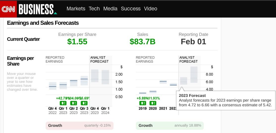 预测范围:到 2023 年底为 148-149 美元。《华尔街日报》的分析师预测每股收益和目标价格较高,而 CNN Business 的每股收益预测略低,导致价格目标不同。2023 年的看涨因素包括强劲的收入增长、多元化、人工智能驱动开发的创新、谷歌云的增长、YouTube 的势头和硬件创新。