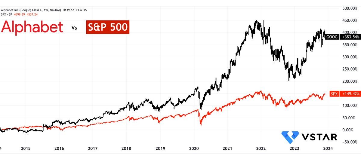 延长期限:在过去的 3 年、5 年和 10 年里,Google 始终领先于标准普尔 500 指数,其回报率令人印象深刻,分别为 48.29%、143.63% 和接近 385%,而标准普尔 500 指数的回报率分别为 25.45%、66.46% 和接近 150%。谷歌相对于标准普尔 500 指数的长期表现始终优于标准普尔 500 指数,这表明其长期的持续增长轨迹和强大的市场地位。