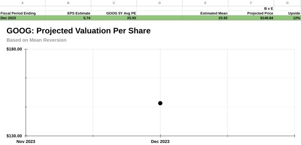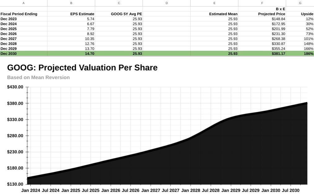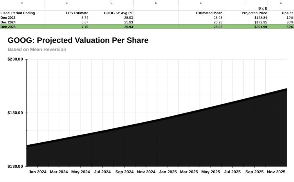 根据均值回归理论,价格可能会继续回归到 26 附近的长期历史均值。该理论建议到 2025 年上涨 52%,目标价为 202 美元。对该理论的综合看法是基于基于 Google 财务业绩在中期不会出现疲软的假设或趋势;因此,所有的上涨空间都在于价格变动。