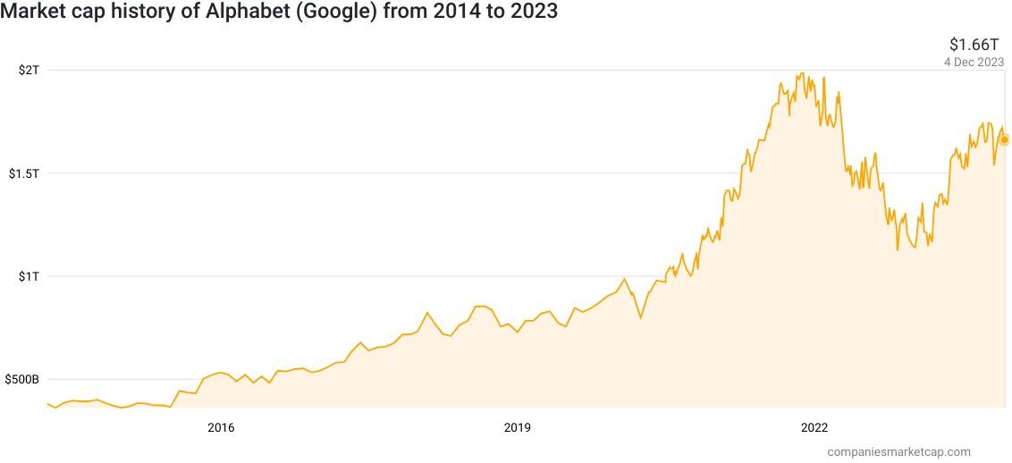 2018:市值:7235.5亿美元生长因子:广告收入:尽管市值稳定,谷歌的广告收入仍然是推动力,保持了其全球顶级广告平台的地位。多元化努力:持续扩展硬件和云服务,旨在实现收入来源多元化,实现可持续增长。2019:市值:9211.3亿美元生长因子:云服务:加强在云市场的影响力,赢得大客户并在竞争格局中展现增长潜力。AI融合:将AI进一步融入各类产品和服务中,提高用户参与度和效率。2020年:市值:1.185万亿美元生长因子:流行病应对:尽管面临全球经济挑战,但对包括谷歌在内的数字服务的依赖增加,推动了使用量和收入。云采用率:寻求数字化转型和人工智能驱动解决方案的企业对 Google Cloud 的采用率持续增长。2021 年:市值:1.917万亿美元生长因子:广告主导地位:在各行业的数字化转型中,在线广告领域持续占据主导地位。人工智能和创新:人工智能的进步、硬件创新(Pixel 设备)以及新兴技术市场的扩张。2022 年:市值:1.145万亿美元,价格大幅下跌超过40%。影响下降的因素:市场波动:全球经济不确定性和市场调整影响了包括谷歌在内的科技股,导致市值下降。