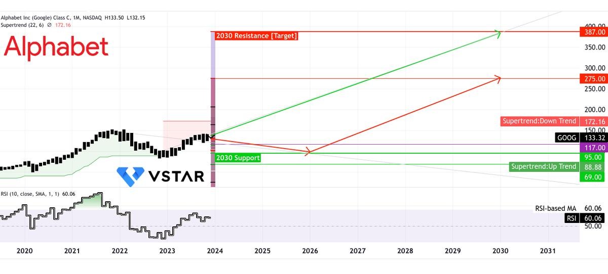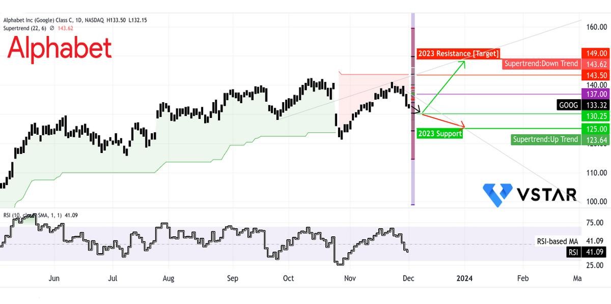 根据当前趋势的势头,到 2023 年底,Google/Alphabet 的股价可能会达到 149 美元。此外,沿着 11 月势头预测的绿色路径,2023 年 12 月底的圣诞老人集会可能会支撑上行趋势。然而,相对强弱指数表明股价可能会下跌,股价可能会达到 130.25 美元,然后到年底达到 125 美元,如红色路径所示。此外,从超级趋势来看,价格可能会重新测试 143.50 美元的阻力位。