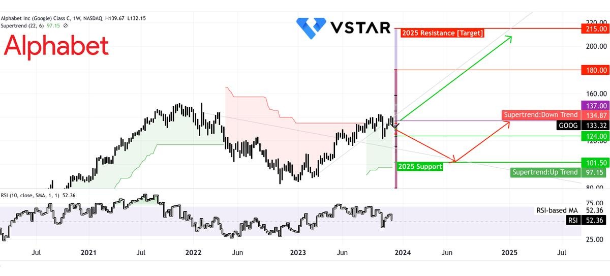 到 2025 年初,谷歌的股价可能会达到 215 美元,以绿色路径为标志,这是基于斐波那契回调的重要阻力。另一方面,由于任何潜在的隐性发展(红色箭头标记)的价格调整,价格可能达到 180 美元。在这两种情况下,137 美元都可能作为主要枢轴点。