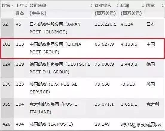 排名第二的日本邮政控股集团其盈利能力相当于中国邮政的80%,排名第三的德国邮政盈利能力相当于中国邮政的55%。