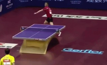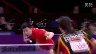 5 产生顺旋侧拐球有四种基本方法:下平拍向左摩擦(图4,马龙发球),左侧立拍向上摩擦(图5,许昕),上平拍向右摩擦,右侧立拍向下摩擦。当然还要加上这四者之间的各种角度的斜拍沿顺时针方向的环形摩擦。图5 左手许昕跨步扑正手的那一板顺旋侧拐弧圈球正是左侧立拍向上摩擦外加上平拍向右摩擦的杰作,球落台后向右横跳足有1米多,几乎横穿了整个球台,使对手接球失误。图4 动画是右手马龙站在反手位的正手大斜线顺旋侧拐发球(左顺下旋,其中顺旋强烈,左侧旋很弱),主要是使用下平拍向左摩擦球底部。球落台后带有强烈向右侧拐。