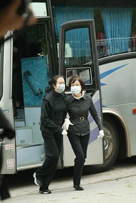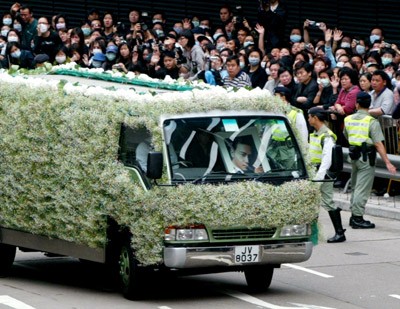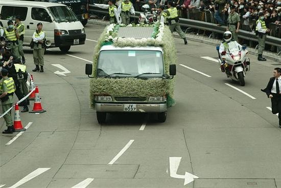 由于前来送行的歌迷众多,为了担心引起混乱,灵车外面覆盖着淡绿的鲜花,后面有一身穿白色警服的交通警骑着摩托车跟随,灵车的挡风玻璃有一张巨幅的张国荣照片,匆匆从等待的歌迷前驶过。