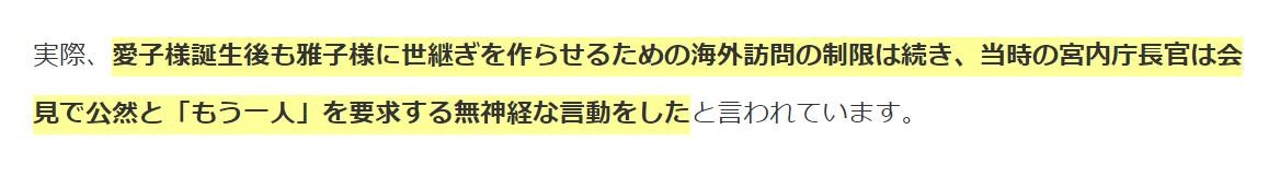 2001年,雅子终于又怀孕了,但可惜的是生下的是一个没有继承权的女孩儿。对于日本皇室而言,雅子的任务还没有完成。无脑的宫内厅长官竟然在公开场合要求太子妃雅子再生一个孩子。但终究雅子没能遂了他们的心愿。