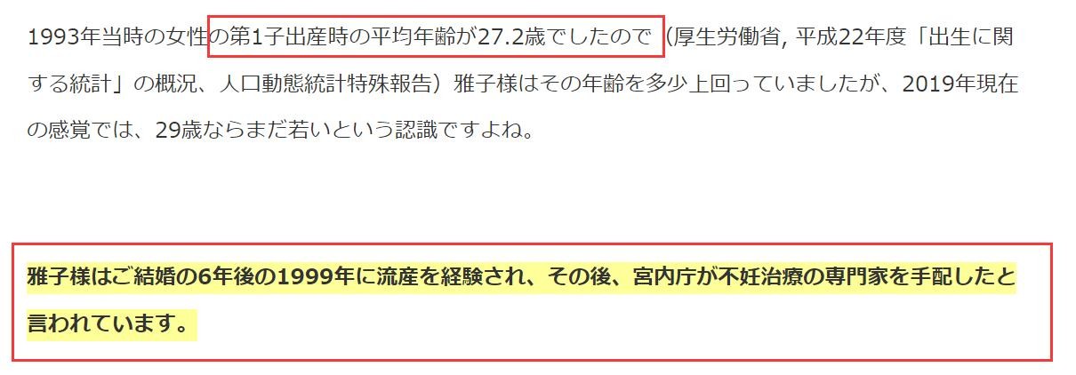 雅子的外交事业被搁置了 ,皇室也没有盼到他们梦寐以求的孩子。直到第六年雅子才好不容易怀孕,但不幸的是孩子流产了。求子心切的宫内厅顾不上关心刚刚失去孩子的雅子的心情,就直接请了治疗不孕不育的专家为她治疗。