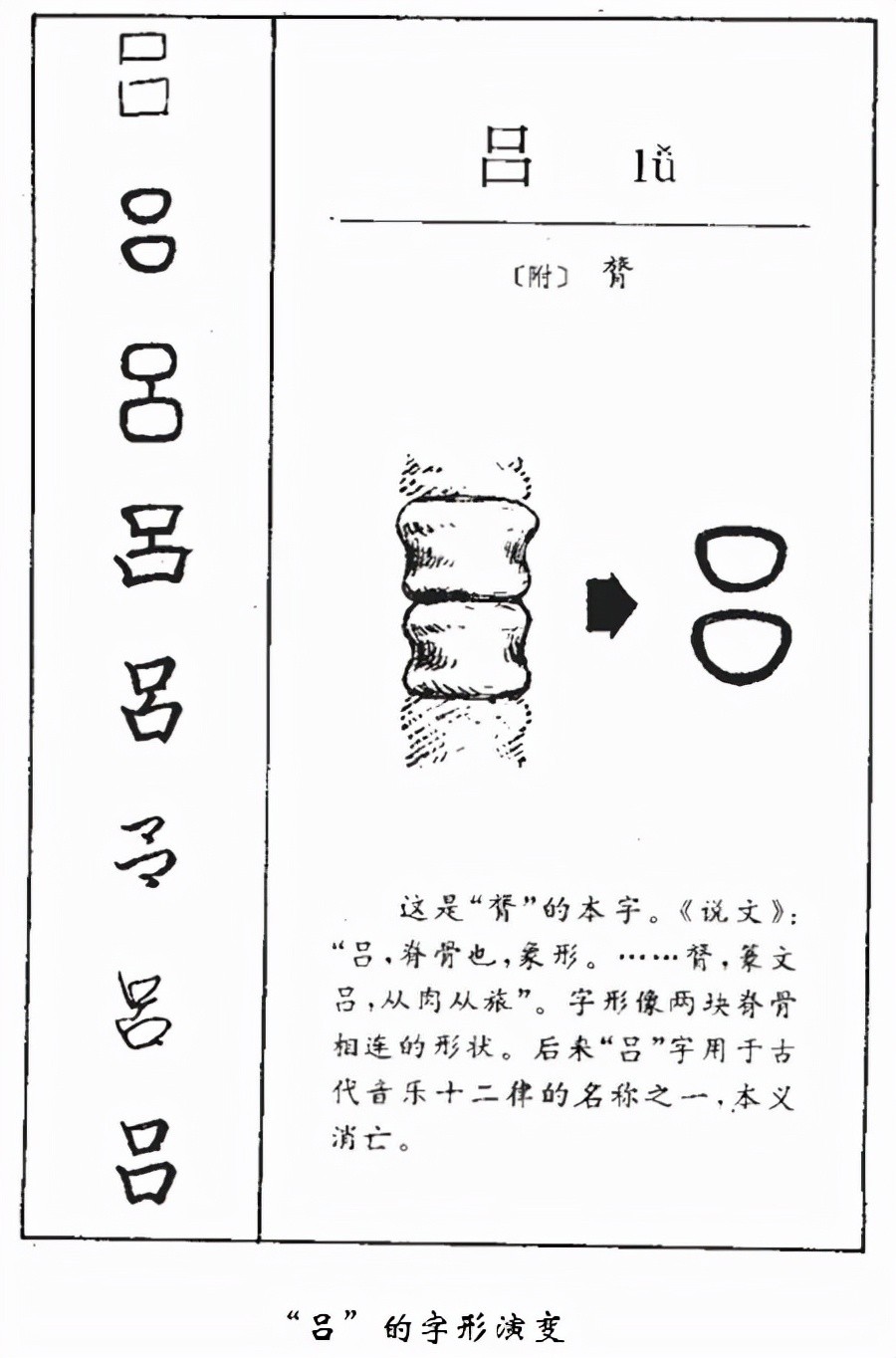 实际上,这个“里”是语音变化的产物。“里”本该写成“吕”,“吕”有脊柱、脊椎的意思。东汉许慎《说文解字》里解释说:“吕,脊骨也。象形。”小篆的字形正像两块脊骨相连的形状。现在的简化字把中间的竖笔省略掉了,脊柱断了,看上去就成了“双口吕”。所以“吕”就是“脊”、“脊”也就是“吕”,“吕脊”是两个同义字构成的词。就像“朋友”这个词里的“朋”和“友”,在古代汉语里都是“朋友”的意思,可以互相解释。