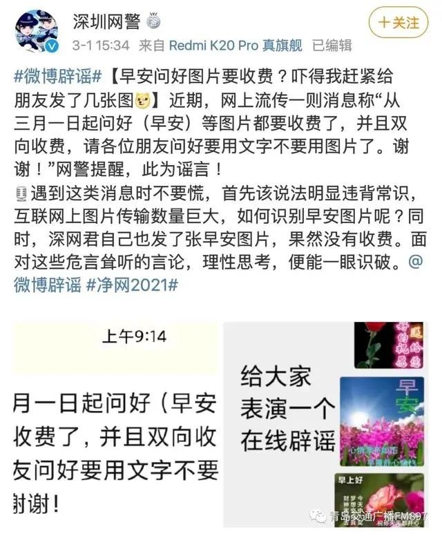 另外,2021年3月1日,深圳市公安局公共信息网络安全监察分局官方微博(深圳网警)发布《早安问好图片要收费?吓得我赶紧给朋友发了几张图》对该网传消息进行辟谣。