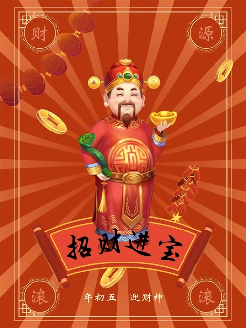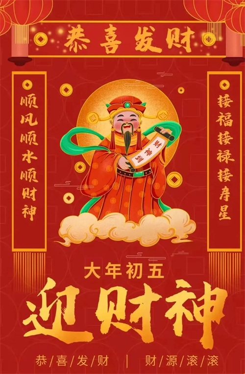 9、初五拜财神,五路财神引进门,祝新的一年里,金银财宝数不尽,财运享通福相随。