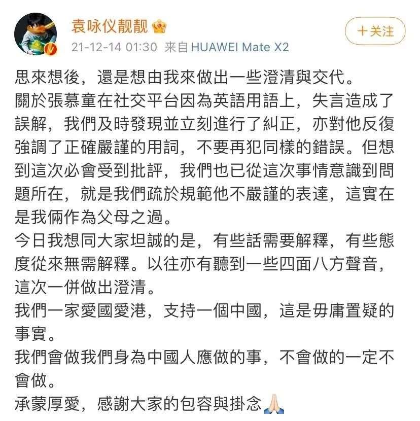她表示,关于张慕童在社交平台因为英语用语上,失言造成了误解,我们及时发现并立刻进行了纠正,亦对他反复强调了正确严谨的用词,不要再犯同样的错误。但想到这次必会受到批评,我们也已从这次事情意识到问题所在,就是我们疏于规范他不严谨的表达,这实在是我俩作为父母之过。