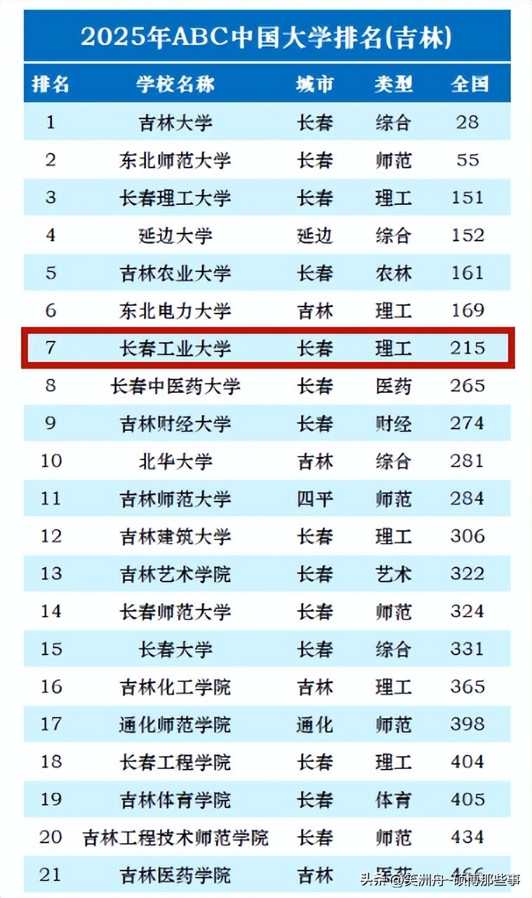2025年长春工业大学排名吉林省第7位, 全国第215位。