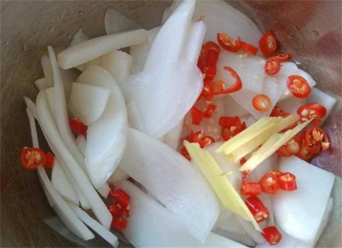第一步,我们把萝卜切成薄片或者细条,用盐搓揉一下,放置10分钟左右,让萝卜的水分出来。