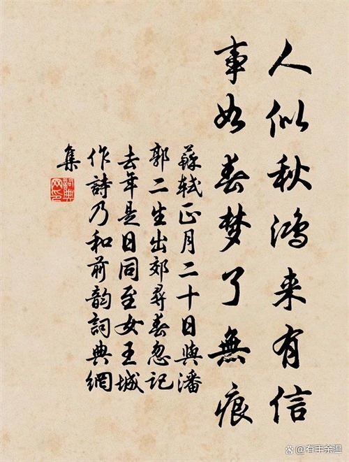 苏轼在黄州的岁月里,与潘丙、郭遘(gòu)两人成为好友,潘丙、郭遘(gòu)曾送别好友古道耕。一年转瞬即逝,又是正月二十日,苏轼想起去年的这天几人送别的场景,如今是思绪万千诗意大发,遂作了一首诗禅诗,而这句 “事如春梦了无痕”便出自此处,全诗名曰:《正月二十日与潘郭二生出郊寻春忽记去年是日同至女王城作诗乃和前韵》:
