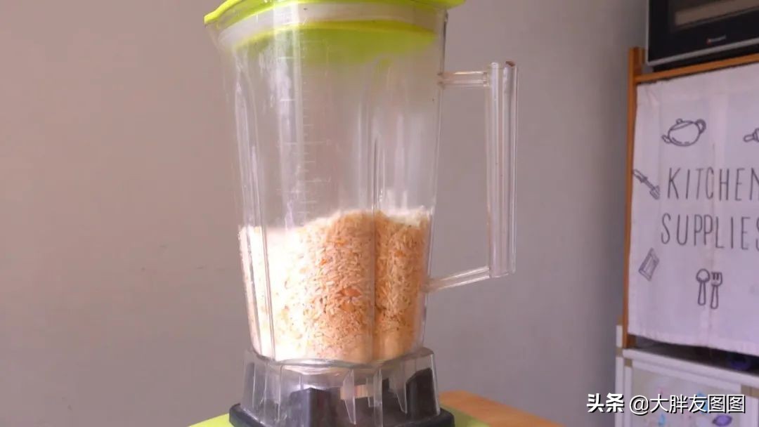 把白胖胖的花生米和微黄色的炒米,一起加入破壁机,搅成碎渣渣,越渣越香。
