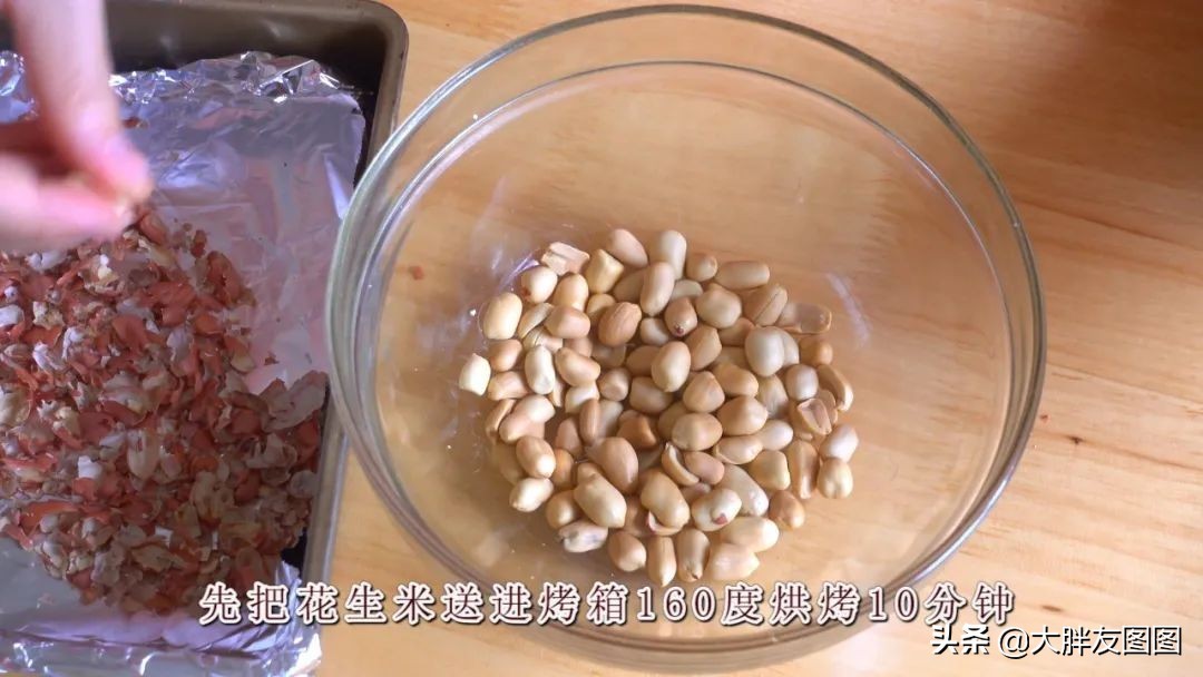 先把花生米送进烤箱160度烘烤10分钟,一搓就把它的衣服脱得干干净净。