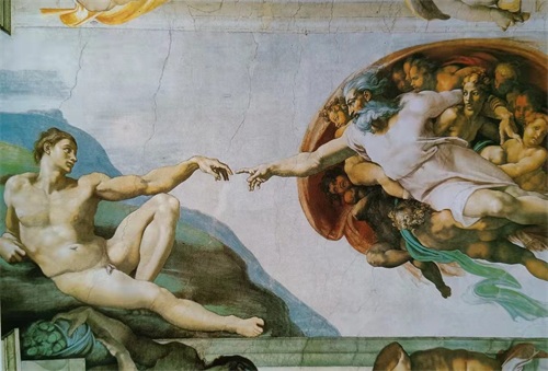 在《创造亚当》中,景色表现很少,行动展开在蓝色天空的背景上,右边是神,由天使们扶持着,自由地飞翔在天空。亚当,是神创造的第一个男人,仿佛刚从酣睡中醒来。从解剖的角度看,简直无懈可击,集中表现了男性的美,整个形象成了那个时代的象征。