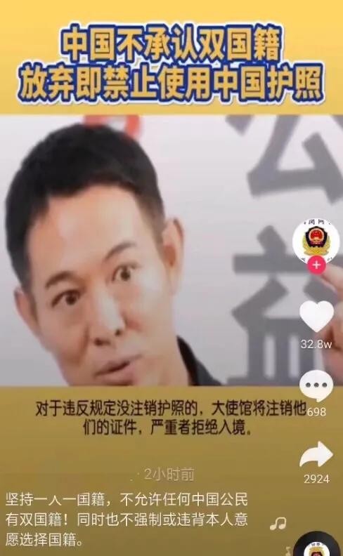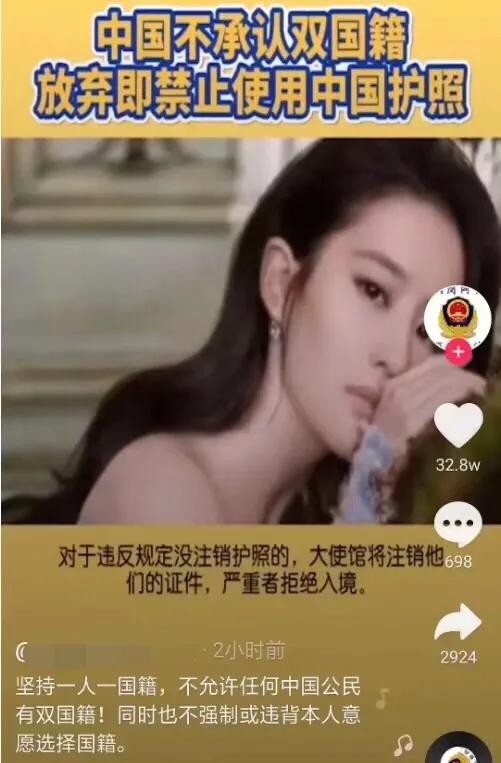 众所周知,中国是不承认双重国籍的,如果中国公民取得了其他国家的国籍,那么就等于放弃了中国国籍,是不存在拥有两个国籍的。不过目前还有许多明星艺人“钻空子”,拥有了他国国籍的同时还在使用着中国护照。12月5日,某官方网警账号在短视频平台上点名批评刘亦菲、吴亦凡、李连杰,并科普呼吁道:“中国不承认双国籍!”