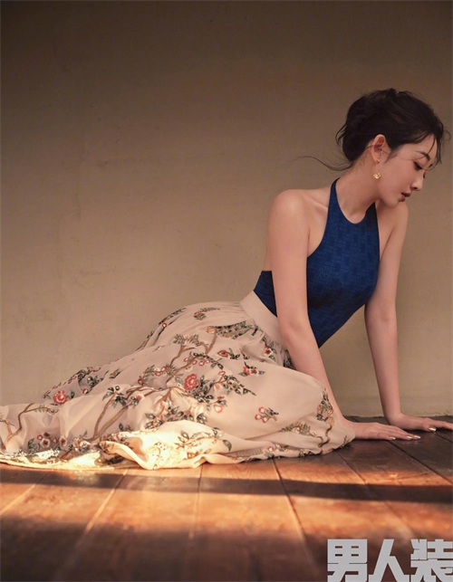蓝色背心搭配花裙子,仿佛画里走出来的美人。