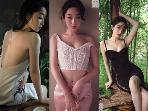 黑色吊带连衣裙,在竹林间勾勒出丰满身姿。