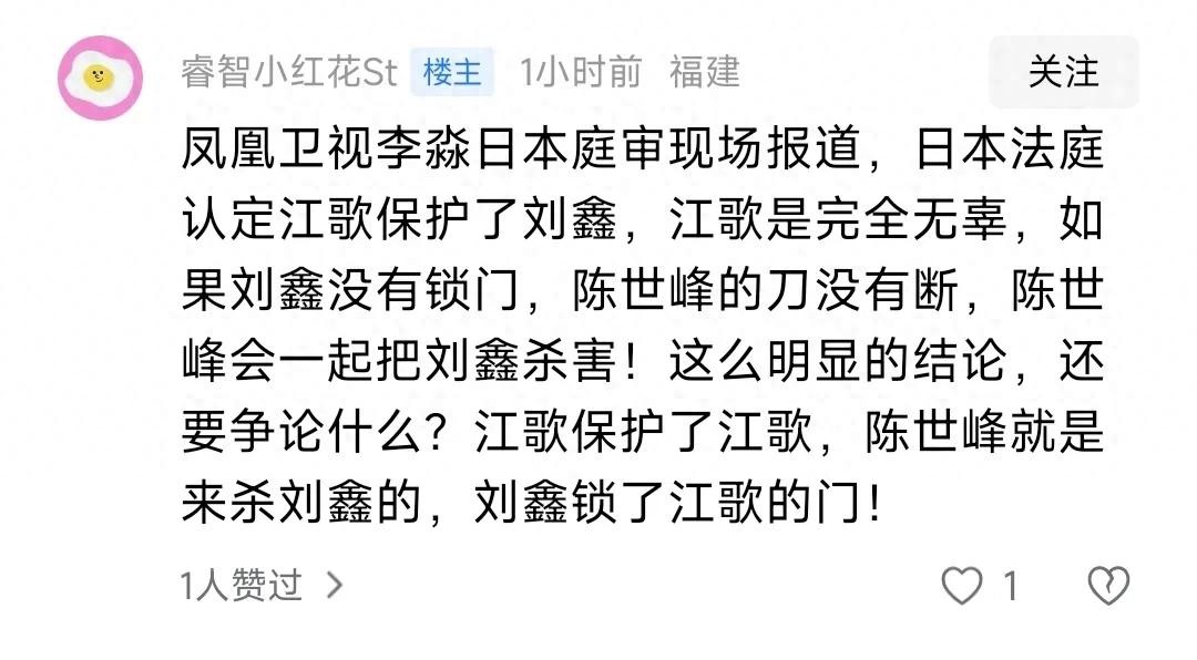 上图认真分析,“小江为什么不进屋避难”,还有“没有发现危险”、“发现危险了来不及”“没有机会”等可能。而且现场无目击者、无监控,江女士是凭什么一口咬定“刘鑫反锁门”的?