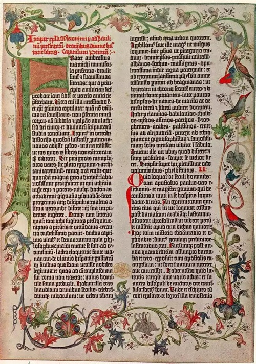 到 1452 年,古腾堡与 Fust 建立了商业伙伴关系,以继续资助他的印刷实验。古腾堡继续改进他的印刷工艺,到 1455 年已经印制了几本圣经。古腾堡圣经由三卷拉丁文文本组成,每页有 42 行字体,并配有彩色插图。