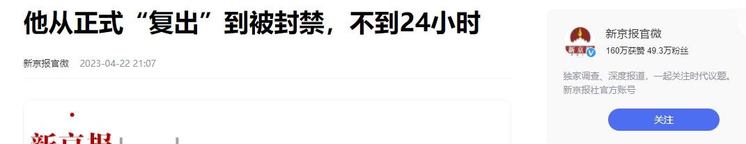 新京报官微2023年04月22日关于:他从正式“复出”到被封禁,不到24小时