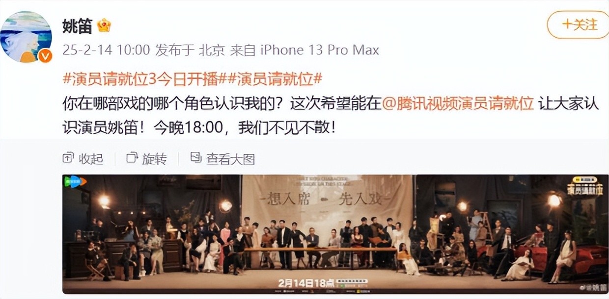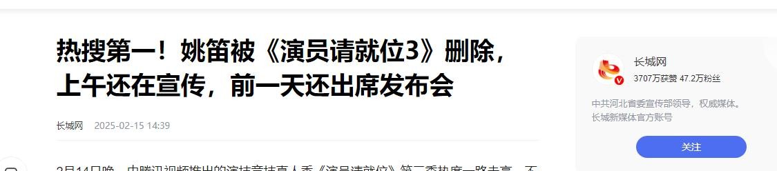 长城网2025年02月15日关于:热搜第一!姚笛被《演员请就位3》删除,上午还在宣传,前一天还出席发布会