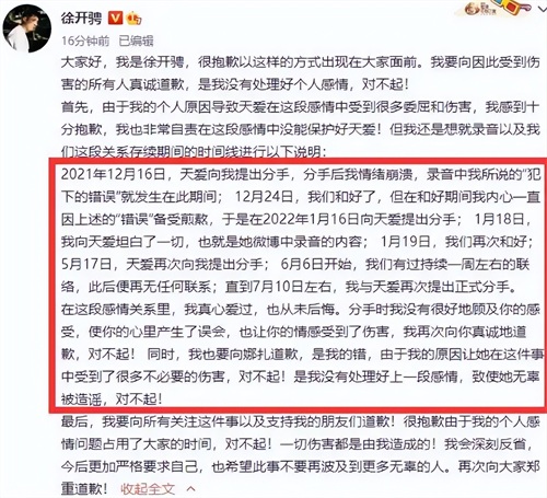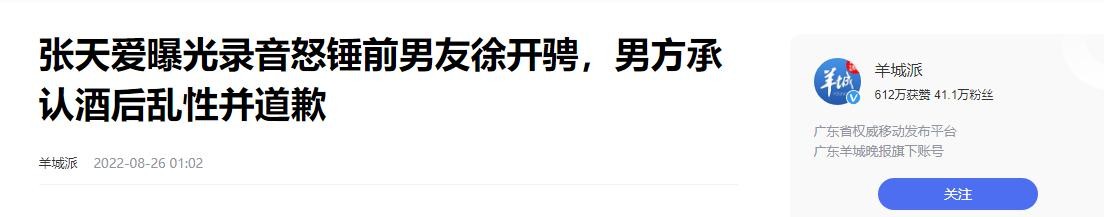 羊城派2022年08月26日关于:张天爱曝光录音怒锤前男友徐开骋,男方承认酒后乱性并道歉