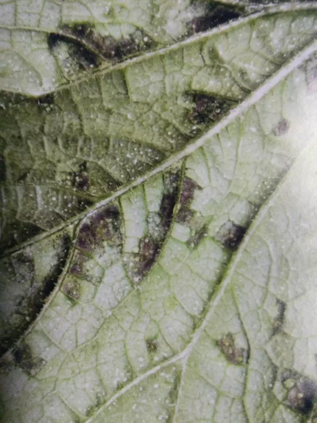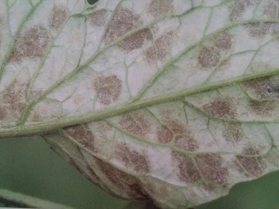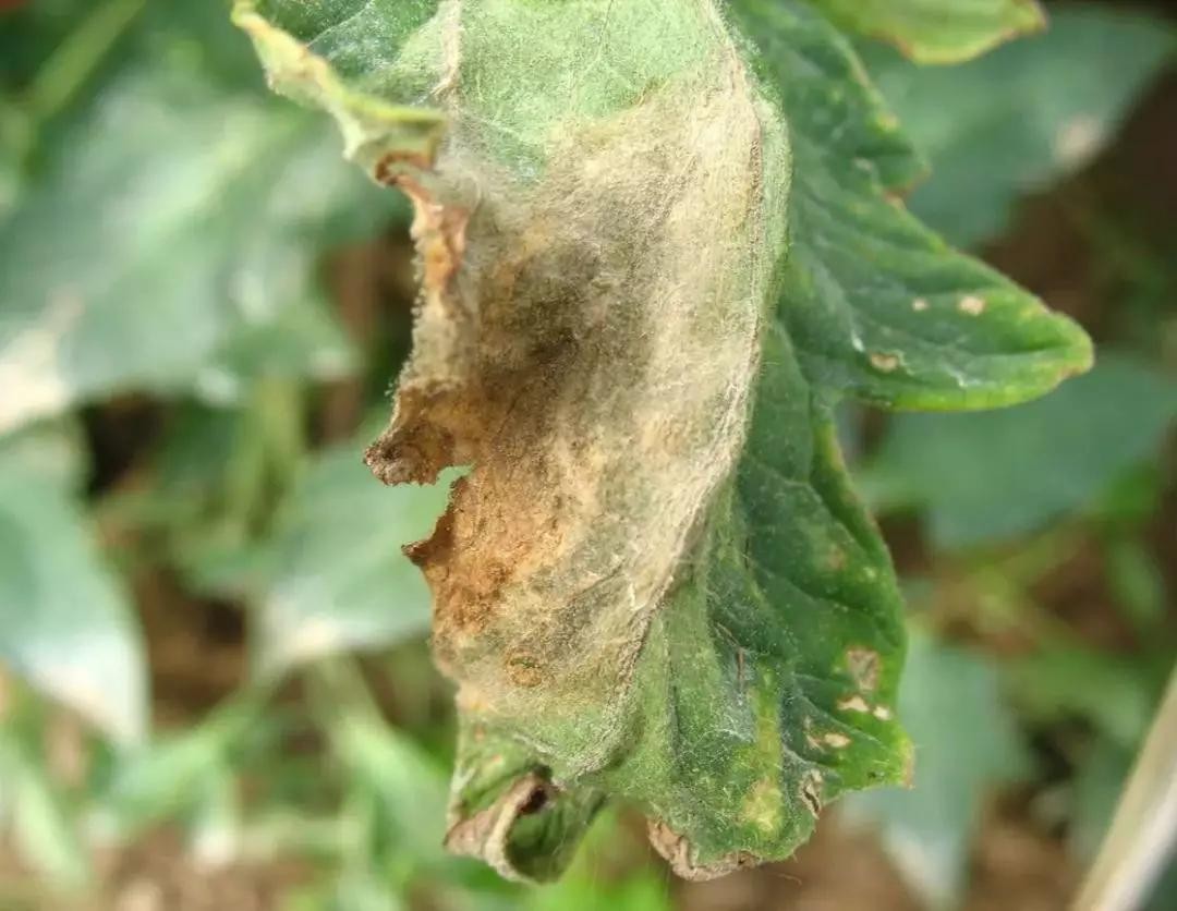 叶背面出现灰白色至黑褐色霉层,后期变成紫灰色或深灰色至黑色或黄褐色,严重时叶片干枯、卷曲。