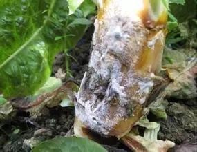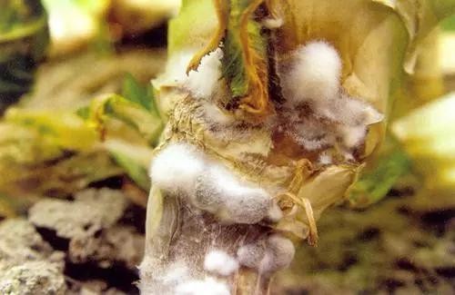菌核病一般只侵害成熟或衰退的植物器官,侵入后迅速引起植物组织坏死。典型症状是茎、果实、花序等腐烂,有时叶部呈坏死斑点。茎基部染病,初生水渍状斑,后扩展成淡褐色,造成茎基软腐或纵裂,病部表面生出白色棉絮状菌丝体。