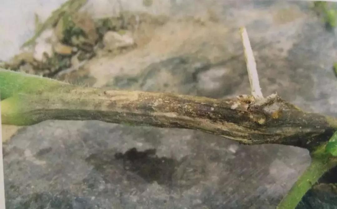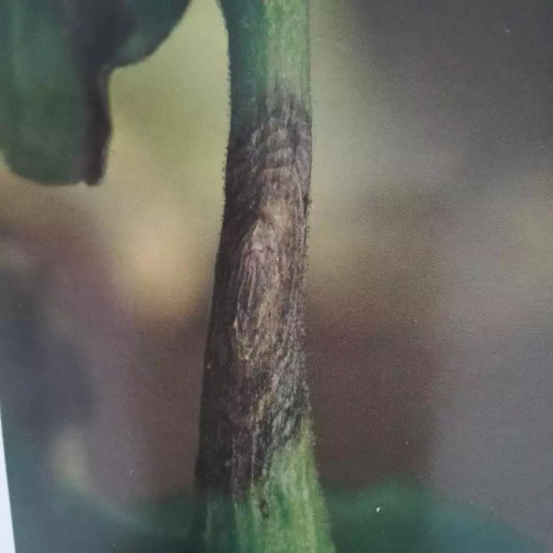 发生时,茎部病斑刚开始呈椭圆形或梭形,褐色、凹陷溃疡斑,后沿茎上下扩展到整株,严重的病部变为深褐色干腐状。