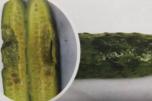 会产生水浸状、近圆形病斑,潮湿时病斑产生菌脓,病斑向瓜条内部扩展,病瓜后期腐烂,有臭味儿。