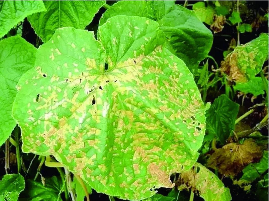 叶片正面形成不规则或椭圆形淡黄色褪绿斑,边缘不明显。