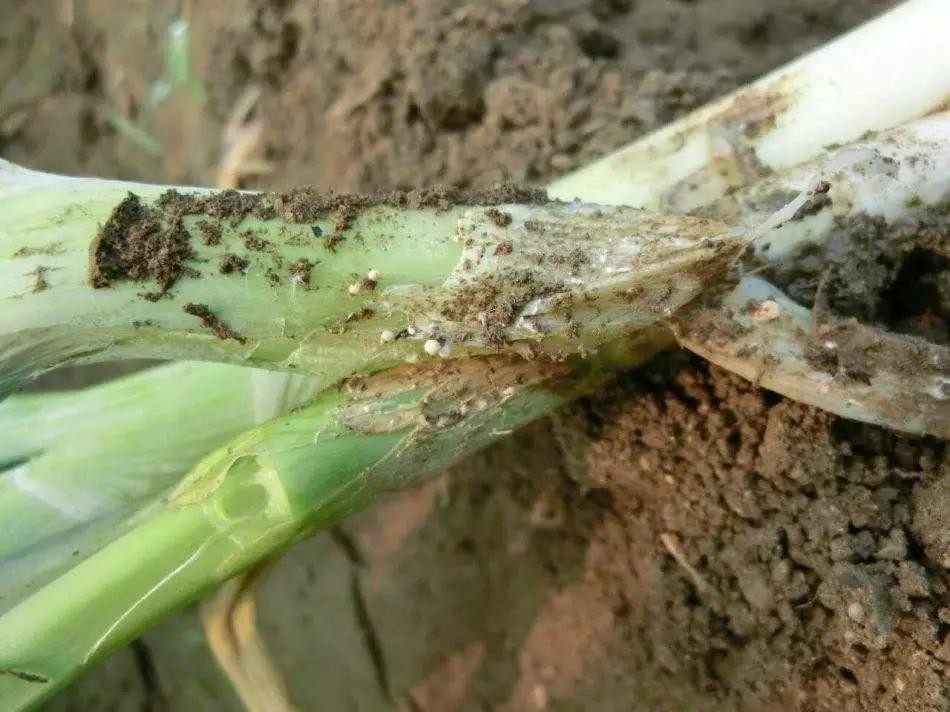 在潮湿条件下,受害的根茎表面或近地面土表覆有白色绢丝状菌丝体。