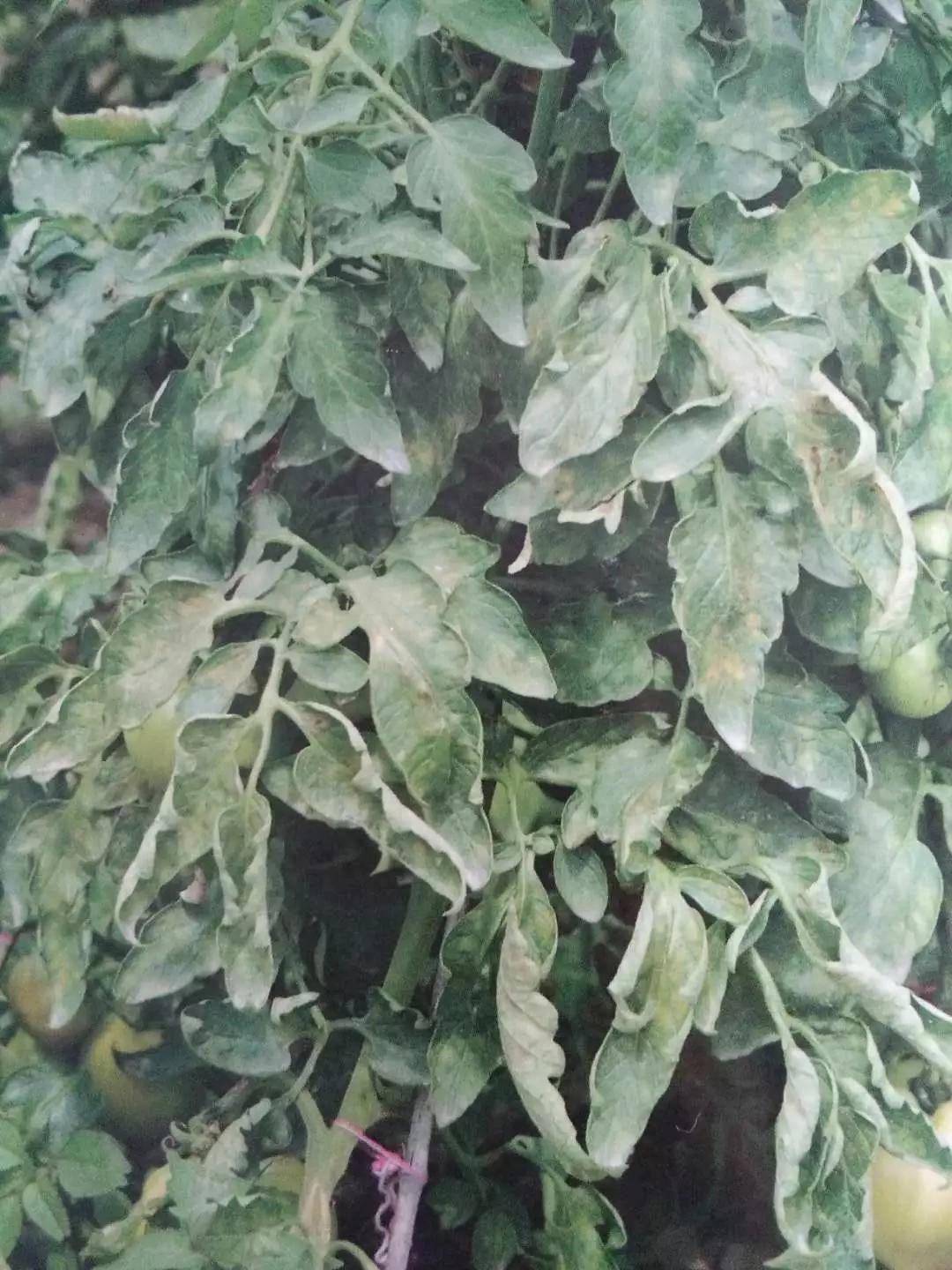 发生时,番茄叶片一般会出现水渍状病斑,湿度大时会有白色霉层的出现。