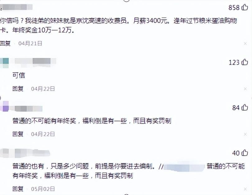 我徒弟的妹妹就是京沈高速的收费员。月薪3400元。逢年过节粮米蛋油购物卡。年终奖金10万一12万。