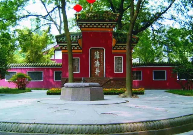 园内还有传为薛涛取水制笺的薛涛井,原名玉女津。井旁立有碑石,上书“薛涛井”三字,为清康熙时成都知府翼应熊的手迹。薛涛晚年曾在住地碧鸡坊自制一种深红色小笺,其色彩绚丽且又精致,世称“薛涛笺”,历代多有仿制。该井水质甘冽,宜酿酒、烹茶,用来制笺优于江水。因为明代蜀王仿制薛涛笺取水之井,后来便误传为薛涛本人汲取该井水制笺,故名。清康熙三年(1664)立“薛涛井”石碑,渐成名胜。清代后期在井周围陆续建起浣笺亭、五云仙馆、泉香榭、流杯池、吟诗楼等纪念建筑,题咏碑刻,匾联甚多。